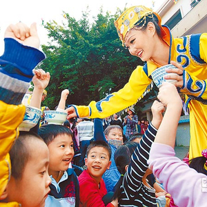 “蒙藏委员会”举行的校园推广活动,舞者让小学生体验顶碗功夫。(图片来源:台湾《中时电子报》)