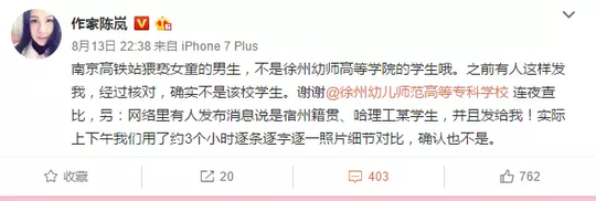 爆料人还辟谣称,猥亵女童的男生也不是徐州幼师高等学院的学生……