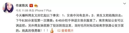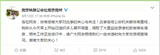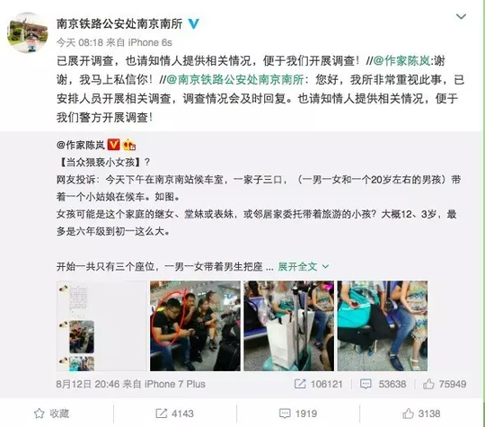 另外公安部治安管理局暨打四黑除四害专项行动办公室官方微博也转发了这条微博,并表示南京铁路警方已经展开调查,官方微博及时回应、展开调查,请网民安心等待;“人肉”等过激行为同样是一种“暴力”,不应采用;家长,孩子必须了解未成人防性侵相关知识和法规提高自我保护意识!