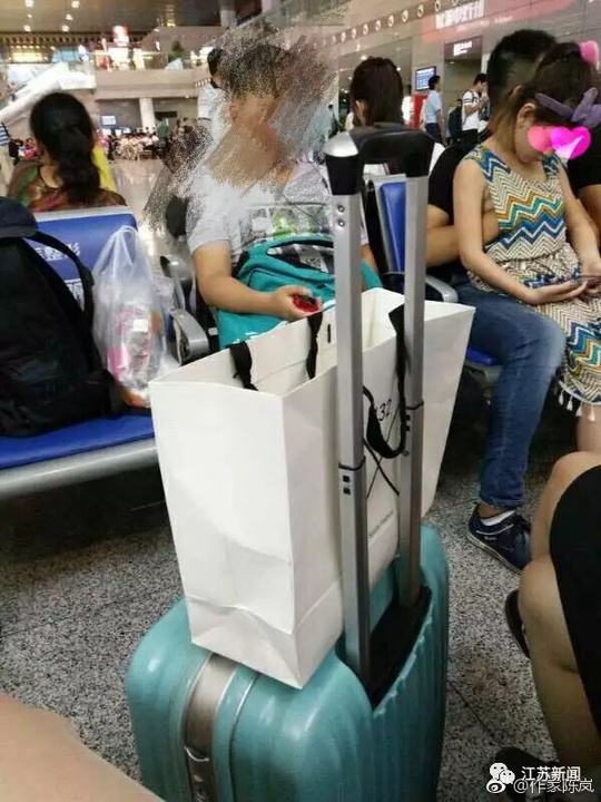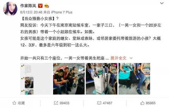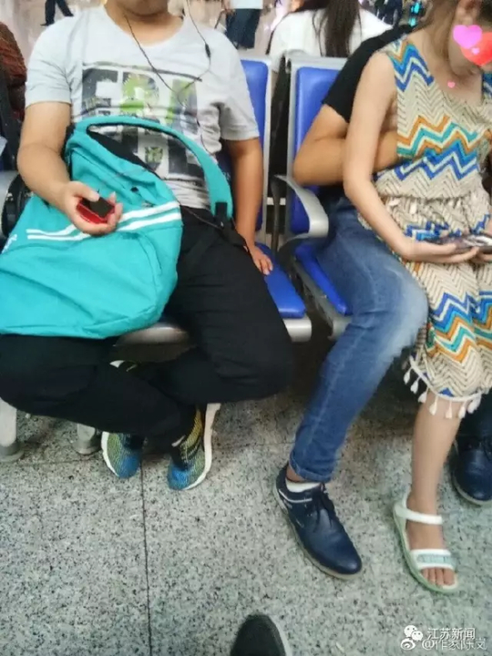 网友投诉:8月12号下午在南京南站候车室,一家子三口,(一男一女和一个20岁左右的男孩)带着一个小姑娘在候车。如图。