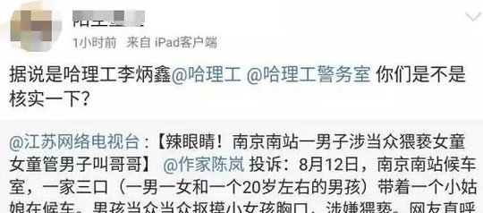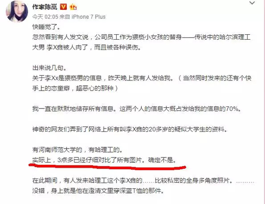 随后,@作家陈岚 在微博辟谣称,神奇的网友们弄到了网络上所有叫李X鑫的20多岁的疑似大学生的资料。有河南师范大学的,有哈理工的。实际上,3点多已经仔细对比了所有图片。确定不是。