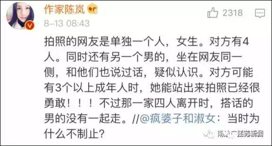 对此,陈岚在回应网友时表示,她与发帖网友交流时判断,涉事女孩应该不是那名小伙子的亲妹妹,因为他在做那种不雅动作时,旁边那名中年男子应该是小伙子的父亲,看到小伙子的举动后并未制止,而是让小伙子带着女孩离开了候车的座位。