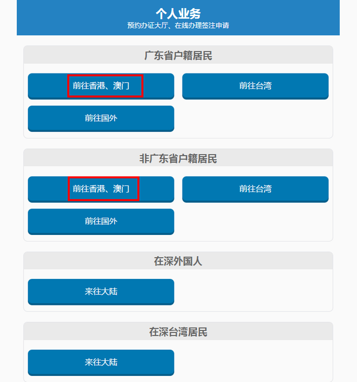 1.点击网址进入深圳市公安局出入境个人业务办理页面