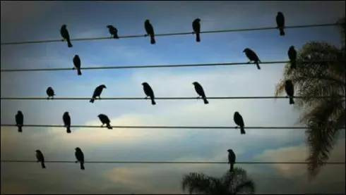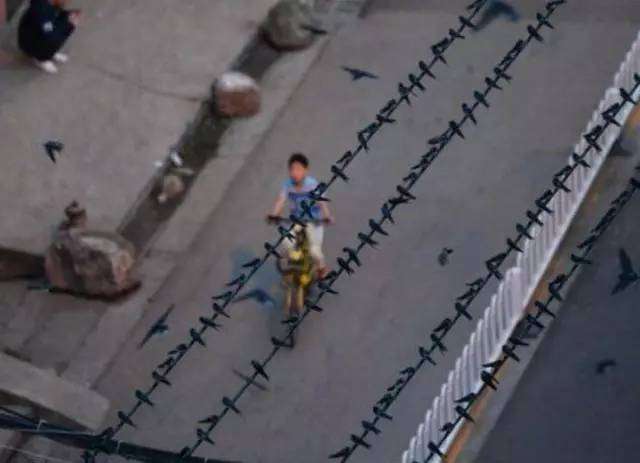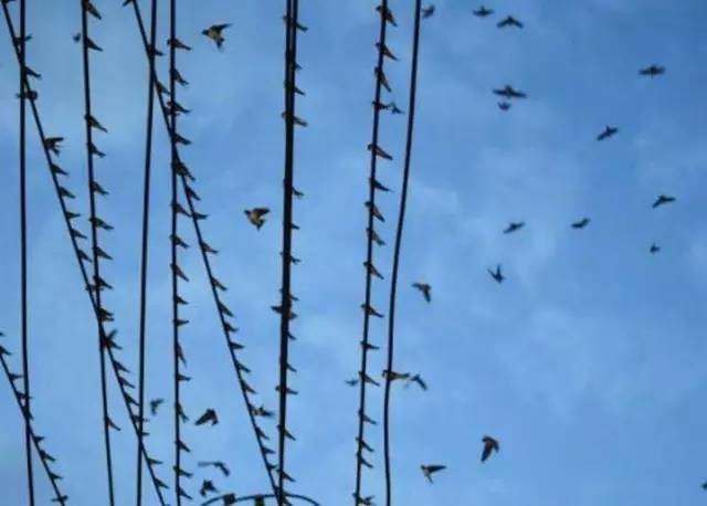 约8点40分,附近的几组电线已经挤满了燕子,它们不约而同地停止了“吵闹”——电线和燕子,就这样形成了一幅幅美丽的“五线谱”图。