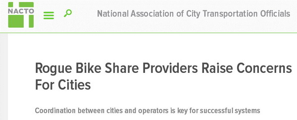 美国全国城市交通管理官员协会4月在其网站上称共享单车企业为“流氓企业”