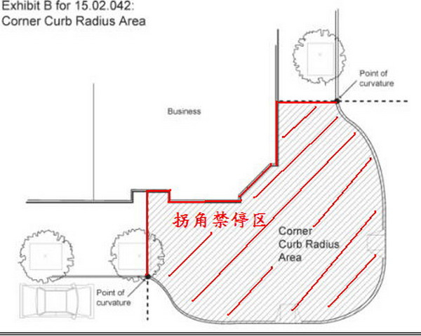 自行车不能在人行道转弯区域停放(不论是否有景观设施区域)。街边休闲区、街边餐饮区、公交车站和候车亭、装卸区、路缘坡道或骑车进出口通道也不能停放。