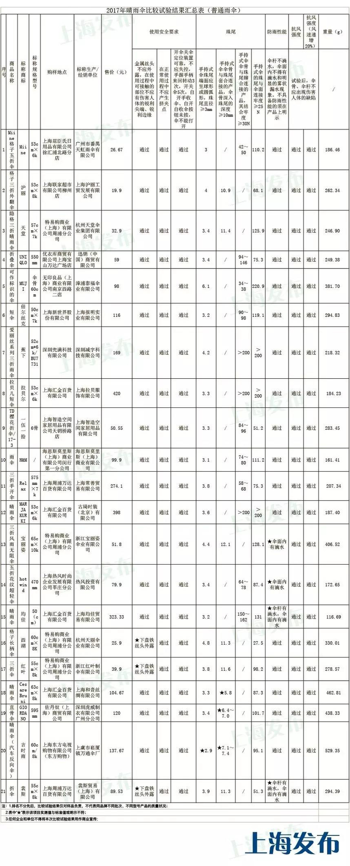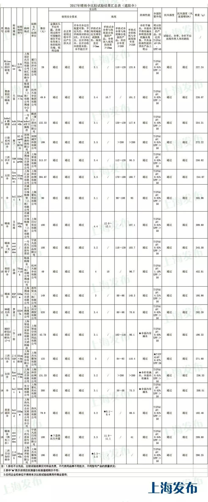 晴雨伞比较试验结果通报