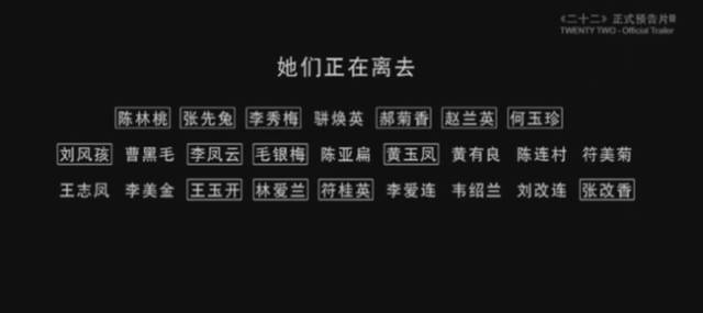 片中二十二位老人,如今只剩九位。每当一位老人离世,他会在片尾处给老人的名字加个框。可最近这些日子,老人走得太快,他甚至都来不及加框。