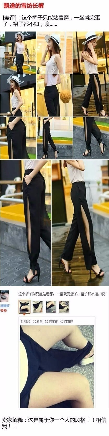 这条飘逸的雪纺长裤,买家给了差评,看了看原因觉得确实没毛病。