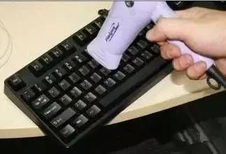 在电脑关机状态下,用冷风吹键盘,藏在缝隙中和按键下的灰尘、毛发和细屑就会被吹出来。