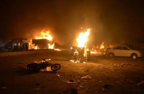这是8月12日在巴基斯坦奎达的袭击现场拍摄的起火车辆。据巴基斯坦媒体12日报道,一辆军用卡车当晚在该国西南部俾路支省首府奎达遭炸弹袭击,至少15人死亡、30人受伤。截至目前,尚无任何组织和个人宣称制造了这起袭击。当地安全人员已封锁事发附近区域并展开调查。