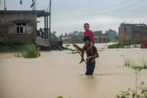 8月13日,在尼泊尔比尔甘杰地区,当地居民涉水前行。尼泊尔内政部称,截至13日下午,多地由强降雨造成的洪灾及山体滑坡事故已造成40人死亡,至少36人失踪。