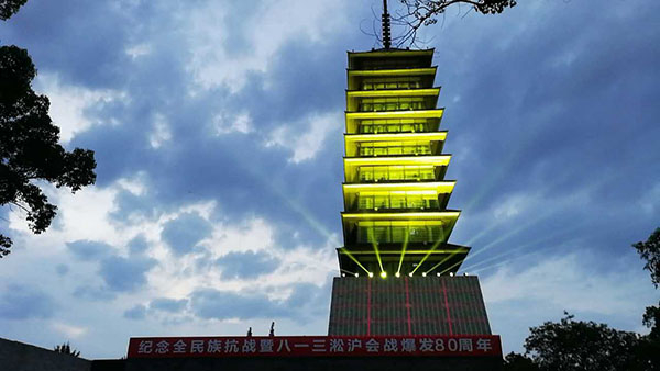 8月12日晚,淞沪抗战纪念馆淞沪塔17年来首次亮灯,纪念“八一三”会战爆发80周年。