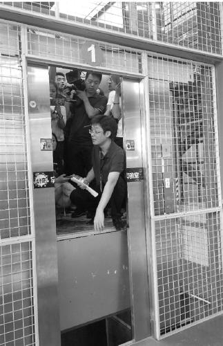 张文主任和其他技术人员一起拉住观看井道记者的手,他说只要一点点失误,试图从轿厢爬出来的人就可能跌进井道。