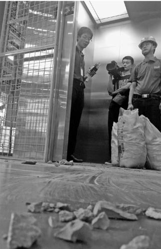 电梯厅门关闭时,由于砖土的阻挡造成了一条宽不足1厘米门缝,厅门自动弹开;约10秒钟后,电梯自动关门,梯门再一次无法正常闭合;如此反复4次,电梯厅门关闭(仍未完全闭合),轿厢门完整闭合,电梯对任何指令失去反应--记者在轿厢内按打开键、楼层键均没有得到响应;另一组记者在电梯外按上下键也没有发现任何响应。