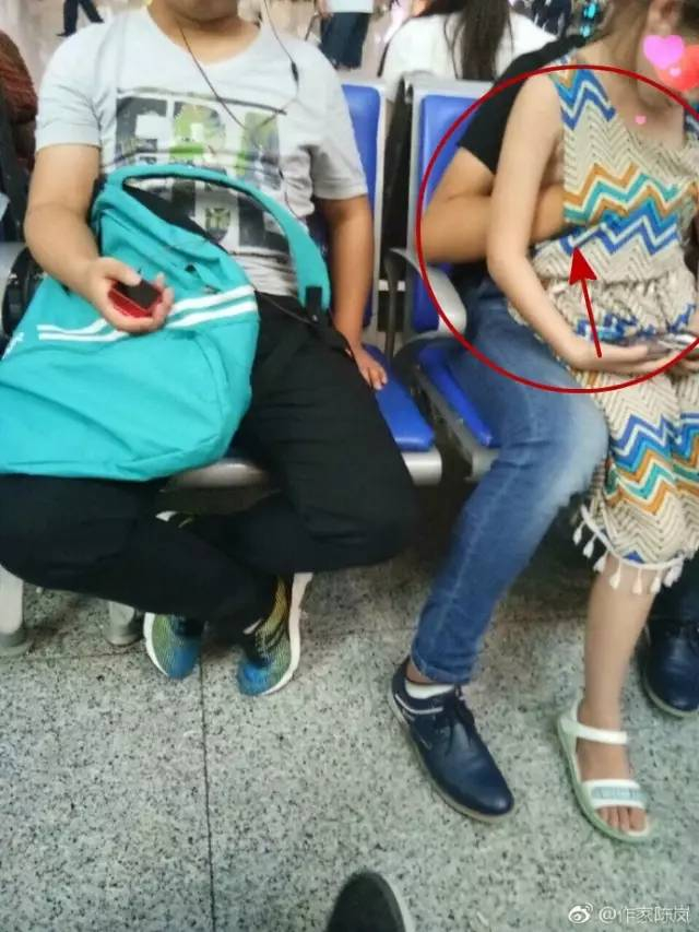 当天傍晚18点20分,小陈坐在B6检票口前的座位上,发现一个穿着无袖连衣裙,年约12岁也就上六年纪的女孩坐在一名年轻男子的腿上,男子看起来和小陈一般大,约摸20岁。刚开始,小陈无意间看到男生把手正放置在女孩的胸部,这个倒也不太让人注意。过了一会儿,小女孩坐到了她身旁玩手机。没想到,年轻男子一把把小女孩拽了过去,并将手从女孩的无袖连衣裙的腋下伸了进去,直接放在了胸部,甚至还在挪动。而女孩坐在他的腿上玩着手机,没有丝毫异样或抵抗的反应。而坐在男子身边一对年约50岁的男女,看起来是他们的爸妈。爸爸似乎看见了男孩的行为,但没有制止和行动,时间持续了至少5分钟。