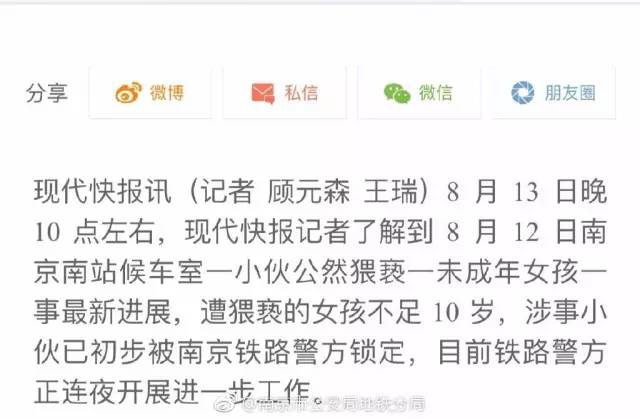 随后在昨天下午,@南京铁路公安处南京南所 发布微博:各位网友,非常感谢大家对此事的关心与关注!此事各级公安机关都非常重视,我所从今天早上开始已组织多人展开调查,调取了大量监控录像和旅客乘车信息,相关工作正在进行中,请广大网友相信我们一定会适时向大家反馈调查情况。谢谢大家的关心! 当地媒体也对此做出了报道