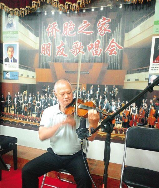■在南沙区珠江街的"侨胞之家",老归侨罗民忠即兴演奏小提琴。 记者 朱清海/摄