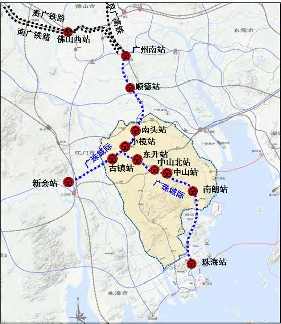 广中珠澳城际(琶洲-中山-珠海-澳门),全长152.6km,可加强广州中心区、南沙与珠江西岸城市之间的联系,目前正在开展前期规划工作。