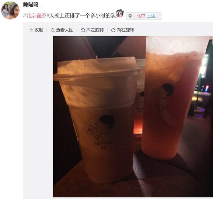 中国企业家杂志记者发现,不管在三里屯太古里还是朝阳大悦城,几乎每一个看到排长龙的人都会停下来拍几张照片,而从店里捧着茶饮出来的人第一个动作也是拍照,接下来他们在屏幕上敲敲打打的动作,意味着他们多半在发微博或者朋友圈。