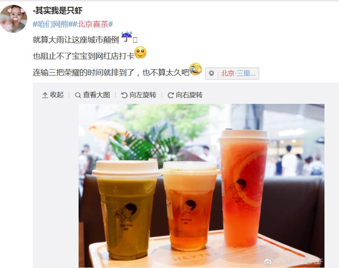 8月12日,雷暴天气下的北京,暴雨断断续续降临,上午10点,喜茶三里屯店和朝阳大悦城店同时开业。糟糕的天气未能阻止消费者对这口“网红奶茶”的热情,人山人海的排队场景在社交网络上引起了热烈的讨论。