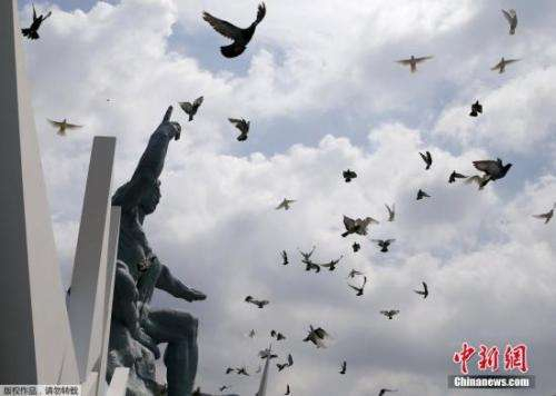 ↑日本长崎和平纪念公园内放飞和平鸽。