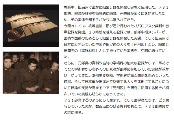 NHK在这一期的特集预告中表示,在二战时期,731部队在中国秘密开发细菌武器并用于实战。战后,因为这支部队将证据彻底消灭,并且原部队成员守口如瓶,事情的真相只有知情者明白。