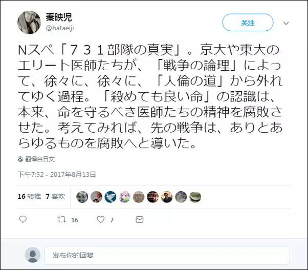 翻译:这是有冲击力、非常沉重的节目,没有能担起战争责任的日本医学界,需要站出来做全方面的解释。