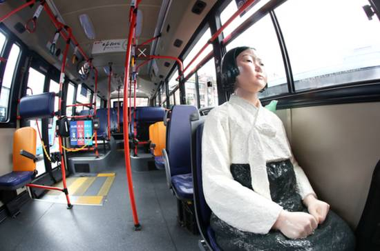 在昨天的世界“慰安妇”纪念日,韩国首尔市的5辆装有“慰安妇”少女像的公交车正式投入运营,这些公交车运行路线经过位于首尔的日本驻韩国大使馆。