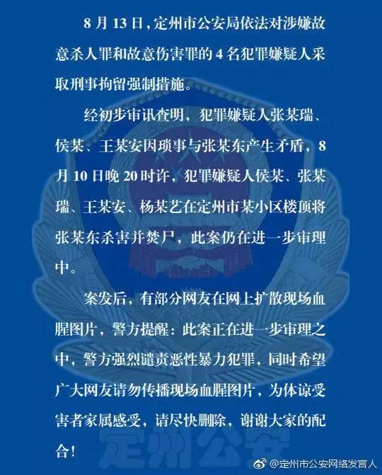 8月10日晚20时许,该市发生一起刑事案件,犯罪嫌疑人侯某、张某瑞、王某安、杨某艺(4人均未满18周岁)因琐事与张某东产生矛盾,在某小区楼顶天台对张某东进行殴打,后将张某东勒死并焚烧。目前,警方已对4名犯罪嫌疑人采取刑事拘留强制措施。