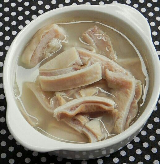 2.瘦肉冲净,切片,焯水后冲净浮沫捞出沥做备用;