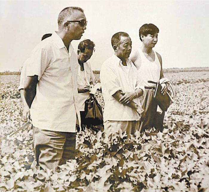 1983年8月,为了让农民增收,时任正定县委副书记习近平(右一)到河间县考察棉花生产。(资料图片)