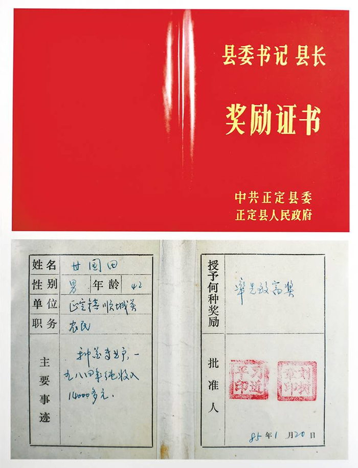 略显陈旧的红色证书封皮,印着“县委书记 县长奖励证书”字样。内页蓝黑色钢笔水写就的字迹虽有褪色仍清晰可见:甘国田,男,42岁,正定镇顺城关农民,种花专业户,一九八四年纯收入14000多元。授予率先致富奖。批准人:习近平(印)、刘树章(印),1985年1月20日。