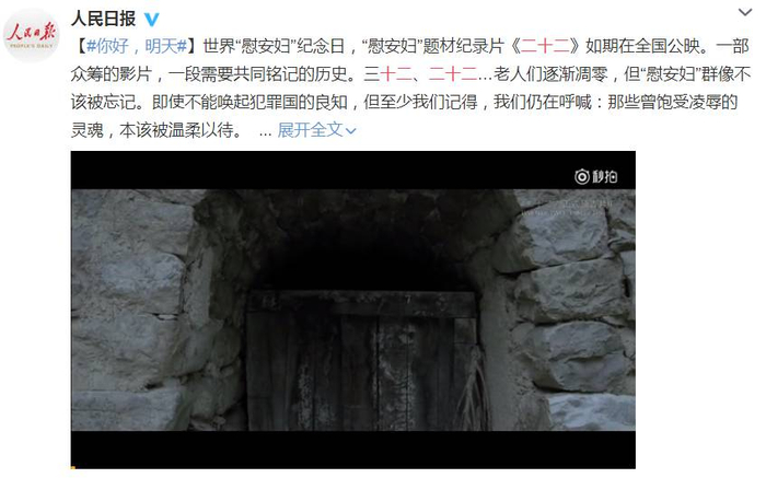 由80后导演郭柯执导的国内首部获得公映许可证的“慰安妇”题材纪录片《二十二》昨天正式在全国公映。