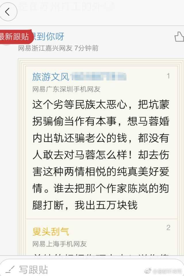 昨天,陈岚在接受央广网记者专访时表示很无奈,有网友跟帖扬言称,“出钱5万,打断陈岚的腿”,也有人更是出言不逊,对其进行人身侮辱,言语不堪入耳。