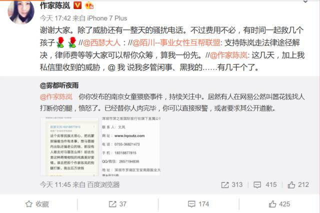 “有网友说我多管闲事……”。但她并不在意,还在微博上调侃网友关于“恋童癖是两情相悦”的说法,“这个威胁还算有点新意。”陈岚还告诉记者,也有人声援她,“人肉”搜索出咒骂她的网友,并贴出该网友联系方式,让其通过法律手段维护自己的权益。