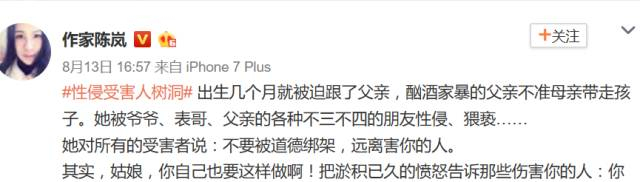 如今,陈岚已经整理数千条#性侵受害人树洞#的微博私信,收到网友的一排排长文中,100%都是熟人作案,侵犯人甚至包括外公、爷爷、伯父等,案件细节令人发指。“十几岁开始,就被大半岁的表哥强奸近十几次……。还有的妈妈在听到女儿投诉,被继父性骚扰后反而大骂女儿。多年后女儿旧事重提,居然怪女儿记仇,还让女儿给做他爱吃的饭菜 ……”