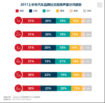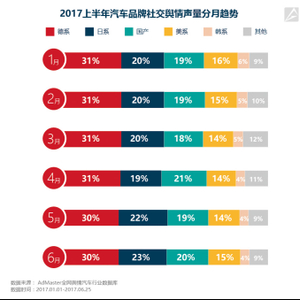 AdMaster 全网舆情汽车行业数据库数据显示,2017年上半年,德系汽车品牌占据了最多舆情声量份额,日系品牌的声量份额略有增长,自主品牌也借助4月上海车展的舞台刷了一把存在感。