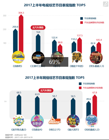随着综艺节目遍地开花,车企在赞助的选择上越来越多,品牌收益也逐步提升。汽车品牌倾向于紧随电视综艺节目表现更好的节目赞助。AdMaster SEI 节目赞助评估指数数据显示,2017上半年,电视综艺中节目表现指数最佳的前五位中有四档节目均有车企赞助,其中《奔跑吧》、《高能少年团》等都为汽车品牌带来了不错的收益。而网综作为新生代综艺节目的根据地,表现最好的前五档节目仅有《妈妈是超人2》获得汽车品牌赞助,取得不错的效果。相信未来会有更多车企转战网综沃土。