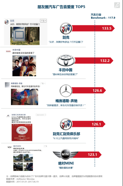 朋友圈广告作为近年来备受关注的新兴广告位,吸引汽车品牌纷纷重金投入,然而广告对品牌影响力如何?AdMaster调研数据显示,综合广告创意喜爱度、广告对品牌知名度、喜爱度和试驾意愿等多项指标,结果表现为在2017年上半年朋友圈汽车广告中,对品牌影响力最优的5支创意分别来自别克、丰田中国、梅赛德斯-奔驰、别克汇别克俱乐部和绝对MINI。