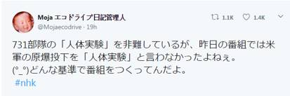 翻译:节目中谴责731部队是“人体实验”,但是昨天的节目中却对美国投下原子弹的“人体实验”只字未提,这节目的底线基准是随便整整就好的吗。