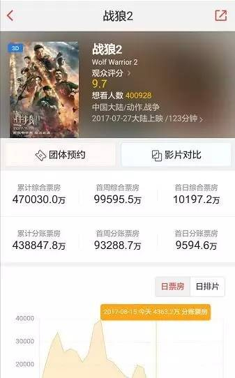 每经小编(微信号:nbdnews)注意到,截至8月15日下午17点,根据猫眼专业版实时数据显示,《战狼2》的票房成绩已突破47亿元人民币。