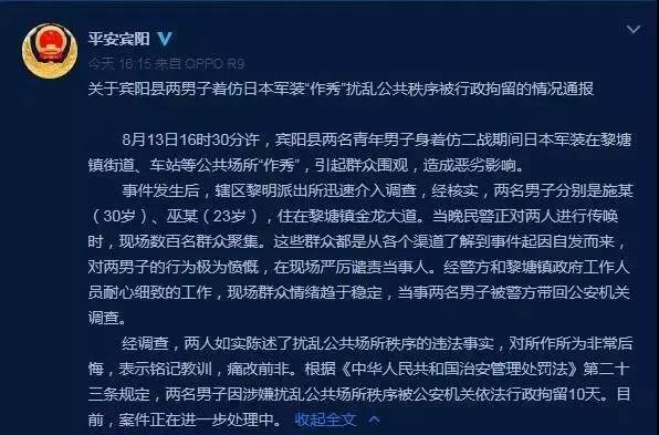 8 月 13 日下午 4 时 30 分许,广西南宁宾阳县两名青年男子身穿仿二战期间日本军装在黎塘镇街道、车站等公共场所"作秀",引起群众围观,造成恶劣影响。 目前,两男子被行政拘留。