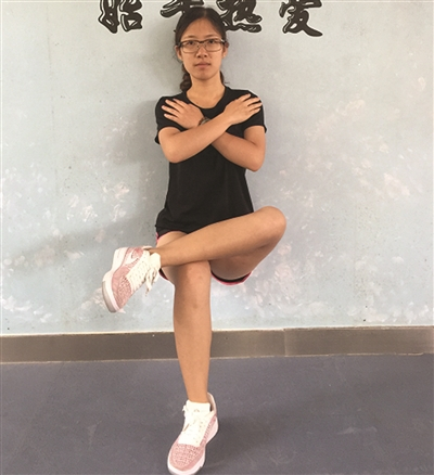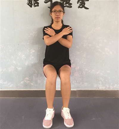 要点:膝关节弯曲,靠墙静蹲。能力提高后,可以单腿静蹲。维持时间30秒-2分钟,大腿有酸胀感,2-4组。