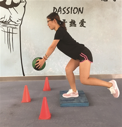 要点:双手负重,单腿分别向前、左、右三个方向(三个方向放标志物)缓慢做蹲起运动,注意臀部要发力。先在平地上做,能力提高后,脚下加软垫子,提高膝、踝的平衡能力和稳定性。重复10-15次,3-4组。