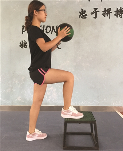 要点:双手负重(可重可轻,其他重物如矿泉水瓶也可以),缓慢下蹲到90度,注意臀部要发力,膝关节不超过脚尖。双手负重,单腿登上台阶,然后缓慢落地。能力提高后,可单腿下蹲或增加负重。重复10-15次,3-4组。