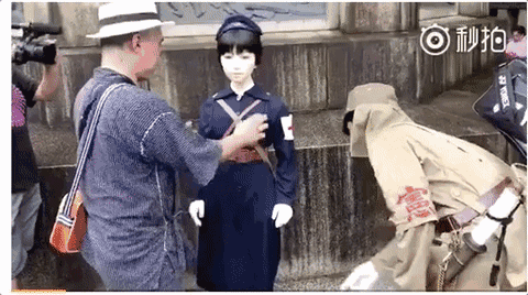 看看这两个猥琐的日本人!弄着一个气娃娃,从头摸到脚,从脚摸到头。看到这些,你还相信他们是在什么祭祀“英灵”吗?