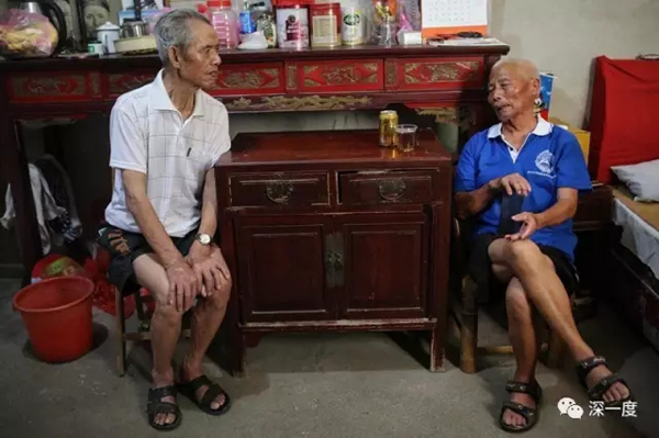 86岁的上崇山村村民王基月(左)和王晋华在家中聊天。2013年时,王基月中了风,记忆锐减。对于自己作为细菌战受害者原告代表的那场对日诉讼,他已回想不起最终结果。王基月的姐姐(16岁)和弟弟(2岁)都感染了鼠疫,两人口渴得厉害。姐姐大声地哭,病发十多个小时就死了。弟弟身上出现红斑点,疼得喊母亲,没来得及看医生,病发二十几个小时也死了。日军烧村时,9岁的王基月刚好从祖母家回来,目睹了家中3间房子在日本兵的把守下烧毁的过程。