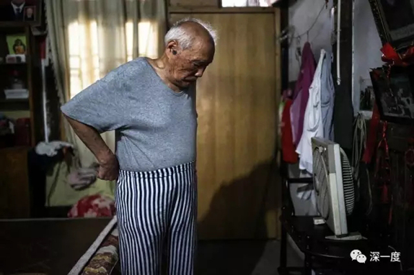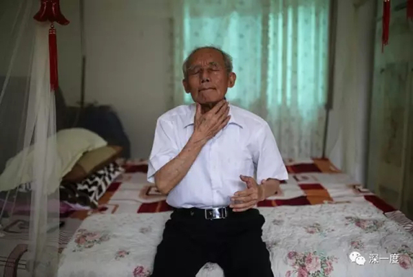 84岁的常德细菌战受害者易孝信在家中给自己做按摩。1942年9月前后,不到4天时间里,只有12户共46人的易家湾村,因鼠疫12人死亡,其中8户失去了年富力强的男人。疫情发生时,易孝信9岁,染疫者睡在地上,以及亲友哭啼的景象,他至今历历在目。长大后,易孝信考入北京师范大学,后进入湖南文理学院任教,如今退休在家。