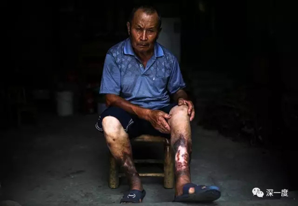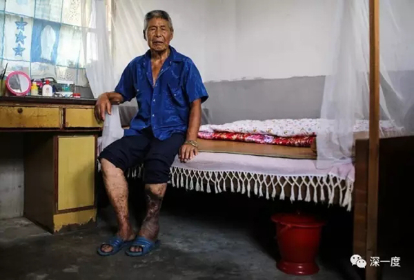 2017年7月,丽水莲都区联城街道,86岁的冯欢喜。14岁时,冯欢喜在田里干活时染上“烂腿病”,患处有香瓜大小,深可见骨。因患处异臭,他曾被人当众嫌弃。为此,他总躲着人群。因在近处找不到老婆,他只好用裤腿盖住伤口,去外地相亲。婚后妻子才发现丈夫是“烂腿”,后悔不已。直到生下孩子,妻子心情才平复。2015年,冯在上海受治,患处得以大面积康复。目前腿部仅剩指甲盖大小、深约1厘米的小洞。因腿部再无异味,冯欢喜改变了春节不走亲戚的习惯,现在有空还会去看村里人打麻将。